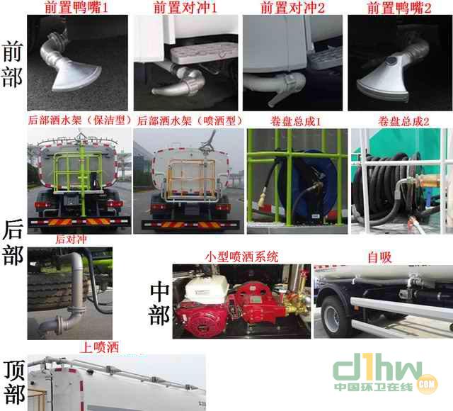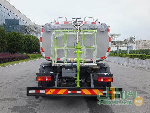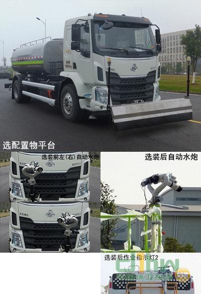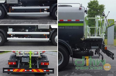 該車(chē)采用底盤(pán)4500mm軸距,10.00R20 18PR,10.00-20 18PR輪胎.該車(chē)型工作裝置有4種配置:A(車(chē)前無(wú)工作裝置,基本型),B(裝氣控噴水架),C(裝液壓噴水架),D(裝護(hù)欄清洗);配置A時(shí),整車(chē)長(zhǎng)8095mm;配置B時(shí),整車(chē)長(zhǎng)8980mm,前伸885mm;配置C時(shí),整車(chē)長(zhǎng)9025mm,前伸930mm,配置D時(shí),整車(chē)長(zhǎng)8960mm,前伸865mm;罐體有效容積9.87立方米,罐體外形尺寸(長(zhǎng)軸×短軸×長(zhǎng)度)(mm):2394×1415×3920,側(cè)面防護(hù)裝置材料材質(zhì)為鋁合金,連接方式為螺栓連接,后防護(hù)裝置的材料材質(zhì)為Q235A,連接方式為螺栓連接;后部防護(hù)裝置的斷面尺寸為240×60mm,離地高度為515mm;可選裝鴨嘴,對(duì)沖,后部保潔型,后部澆灌型,上綠化澆灌,自吸,卷盤(pán),小型噴灑系統(tǒng)等裝置,該系列選裝對(duì)于整車(chē)尺寸,重量變化可忽略不計(jì).隨底盤(pán)選裝駕駛室外觀;隨底盤(pán)裝ABS.ABS型號(hào)/企業(yè): ABS-E 4S/4M/ 威伯科汽車(chē)控制系統(tǒng)有限公司.