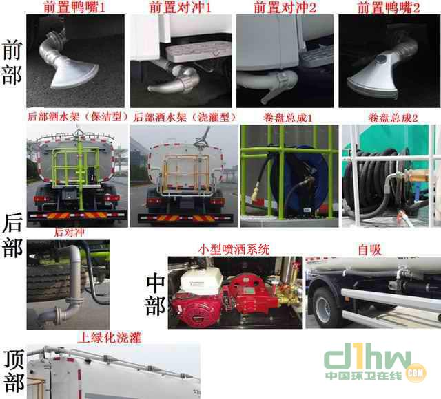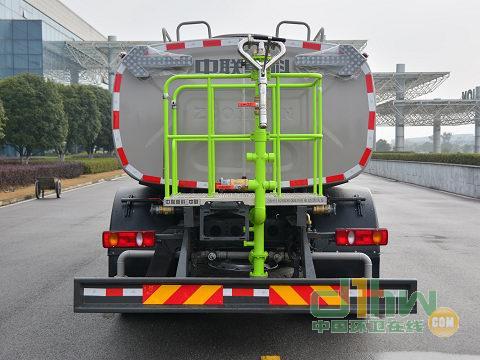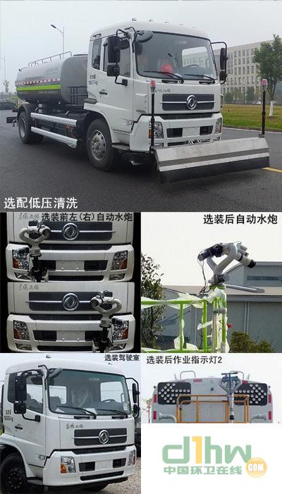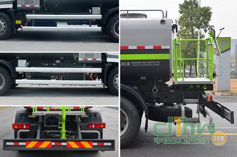 該車采用底盤4500mm軸距,10.00R20 18PR,10.00-20 18PR輪胎.該車型工作裝置有4種配置:A(車前無工作裝置,基本型),B(裝氣控噴水架),C(裝液壓噴水架),D(裝護(hù)欄清洗);配置A時(shí),整車長8095mm;配置B時(shí),整車長8980mm,前伸885mm;配置C時(shí),整車長9025mm,前伸930mm,配置D時(shí),整車長8960mm,前伸865mm;罐體有效容積9.87立方米,罐體外形尺寸(長軸×短軸×長度)(mm):2394×1415×3920,側(cè)面防護(hù)裝置材料材質(zhì)為鋁合金,連接方式為螺栓連接,后防護(hù)裝置的材料材質(zhì)為Q235A,連接方式為螺栓連接;后部防護(hù)裝置的斷面尺寸為240×60mm,離地高度為515mm;可選裝鴨嘴,對沖,后部保潔型,后部澆灌型,上綠化澆灌,自吸,卷盤,小型噴灑系統(tǒng)等裝置,該系列選裝對于整車尺寸,重量變化可忽略不計(jì).隨底盤選裝駕駛室外觀;隨底盤裝ABS.ABS型號/企業(yè): ABS-E 4S/4M/ 威伯科汽車控制系統(tǒng)有限公司.