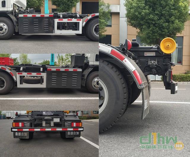 選用3500mm軸距底盤,裝有ABS,型號:DETC-ABS-4S/4M;生產(chǎn)廠家:東風(fēng)電子科技股份有限公司汽車制動系統(tǒng)公司.動力蓄電池種類為三元鋰蓄電池,生產(chǎn)企業(yè)為桑頓新能源科技有限公司,驅(qū)動電機(jī)類型為永磁同步電機(jī),型號為TZ290XS065M0701,額定功率為65kW,峰值功率為110kW,生產(chǎn)企業(yè)為湖南意譜電動系統(tǒng)有限公司;電機(jī)控制器型號為KTZ37X40S10C,生產(chǎn)企業(yè)為湖南意譜電動系統(tǒng)有限公司;側(cè)面防護(hù)裝置由電池罩及防護(hù)欄組成,防護(hù)欄材質(zhì)為鋁合金,連接方式為螺栓連接,后部防護(hù)裝置材質(zhì)為Q235A,連接方式為螺栓連接,截面尺寸為(mm)120×55,離地高度為475mm.專用裝置由拉臂鉤總成,液壓系統(tǒng)等組成,專用功能為吊裝,運輸,傾卸連體式垃圾壓縮箱,用于城鄉(xiāng)生活垃圾轉(zhuǎn)運.產(chǎn)品技術(shù)階段:發(fā)展期;銷售區(qū)域:可全國銷售.